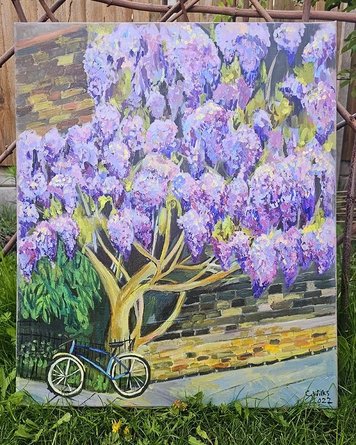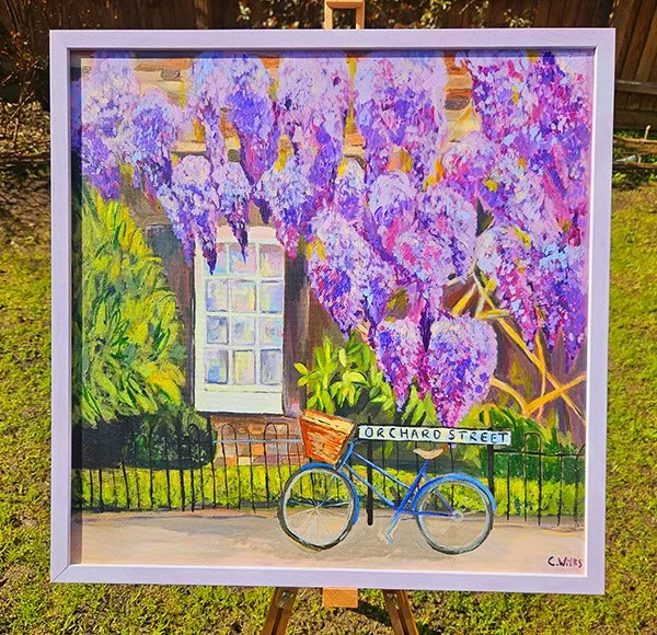 Wisteria on Orchard Street IIThis painting really says Cambridge to me- the wisteria in full bloom and a bike casually locked up against the railings at the corner of Orchard Street. The wisteria on this highly photographed street of Cambridge truly is spectacular in April and May.