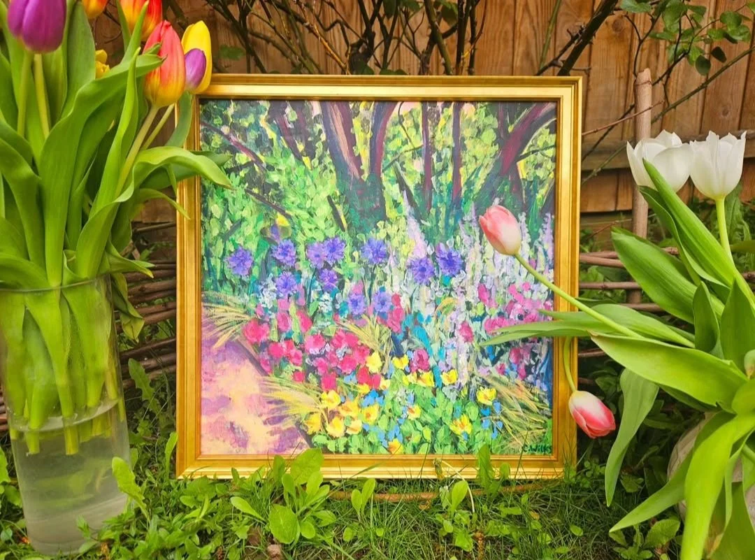 Original acrylic painting on a 30 cm x 40 cm canvas board. Framed in painted gold.