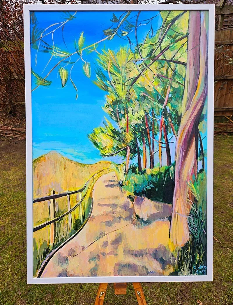 Original acrylic painting on a 60cm x 90cm deep edged canvas. This is framed in white.